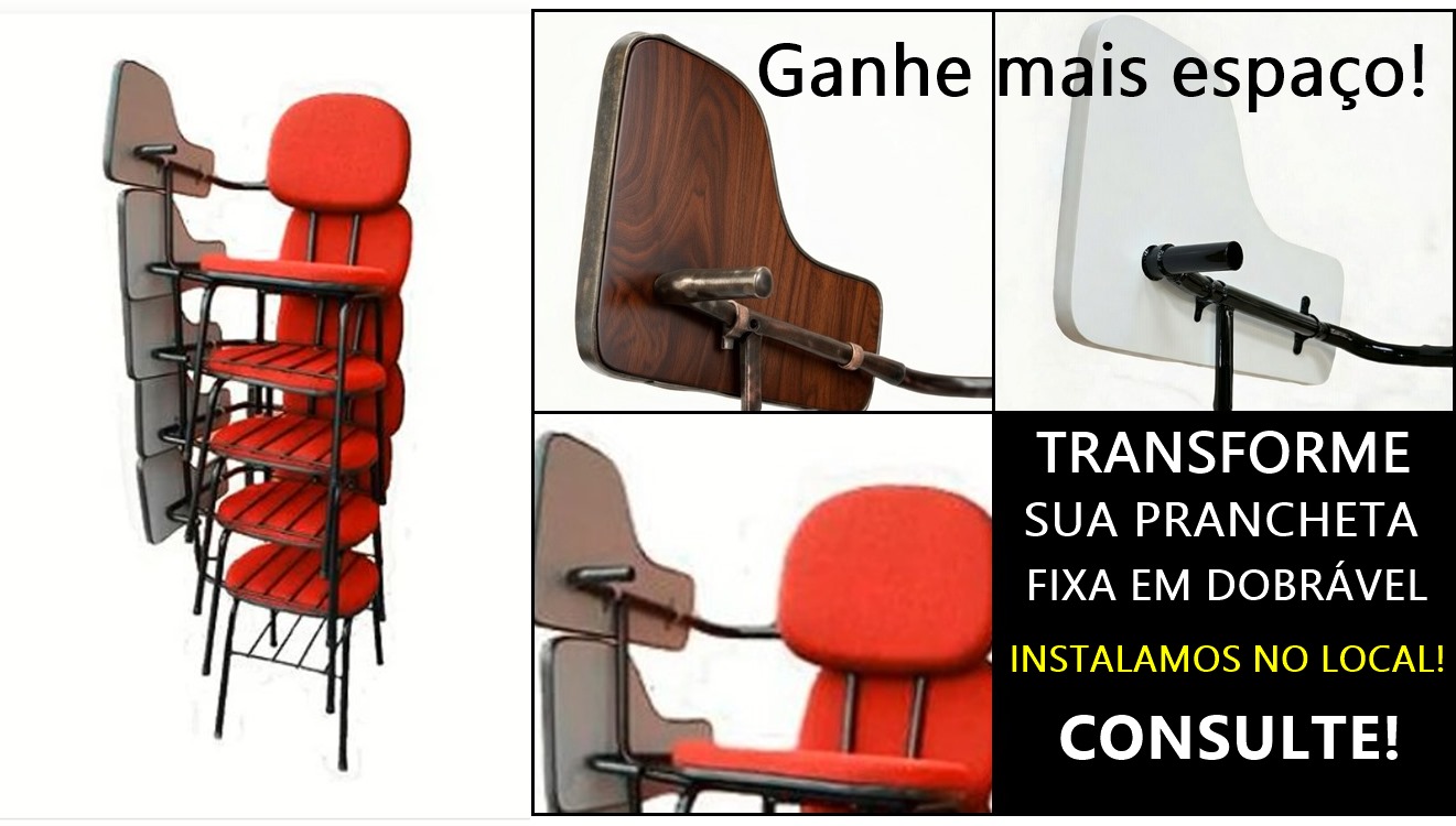 Transforme suas pranchetas fixas de suas cadeiras carteiras universitárias escolares em pranchetas DOBRÁVEIS e ganhe muito mais espaço. Fazemos a instalação no local. CONSULTE-NOS para mais detalhes e orçamentos!